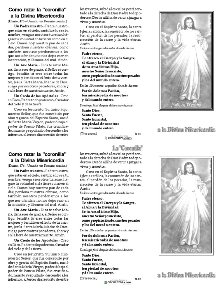 Novena coronilla de la divina misericordia pdf tráeme a toda la humanidad hoy especialmente a todos los pecadores y sumérgelos en la inmensidad de mi misericordia. La novena consiste en rezar la Coronilla de la Divina Misericordia junto con las oraciones que Jesús le. Misericordia para que alabemos la omnipotencia de tu Misericordia por los siglos de los siglos.